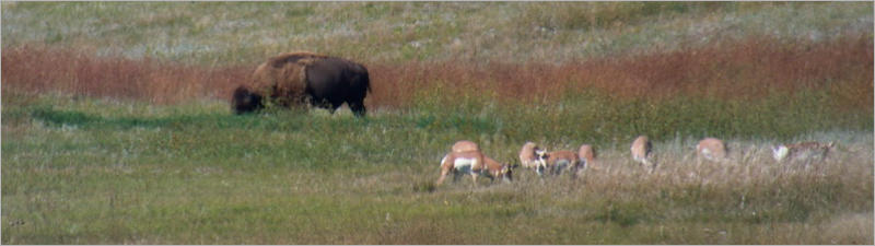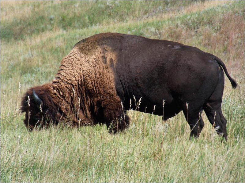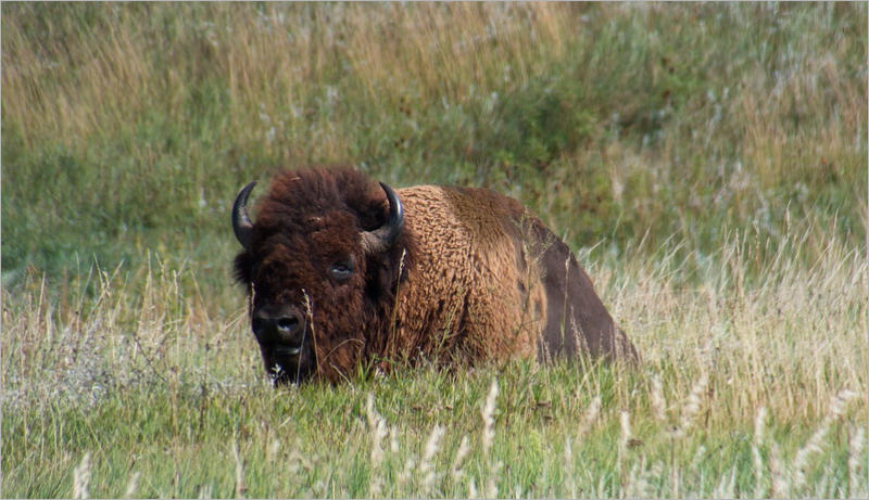Diese waren inzwischen tiefer in die Weide gezogen. Nicht weit entfernt grasten ein paar Bisons.