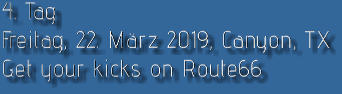 Infobox:Gefahren: 126 MeilenGelaufen: recht wenigWetter: morgens Regen, tagsüber Sonnenschein mit heftigen Winden, abends Regen- und Hagelschauer bei 17 bis 20 °CMotel:Buffalo Inn Motel - Canyon, TX ++1/2