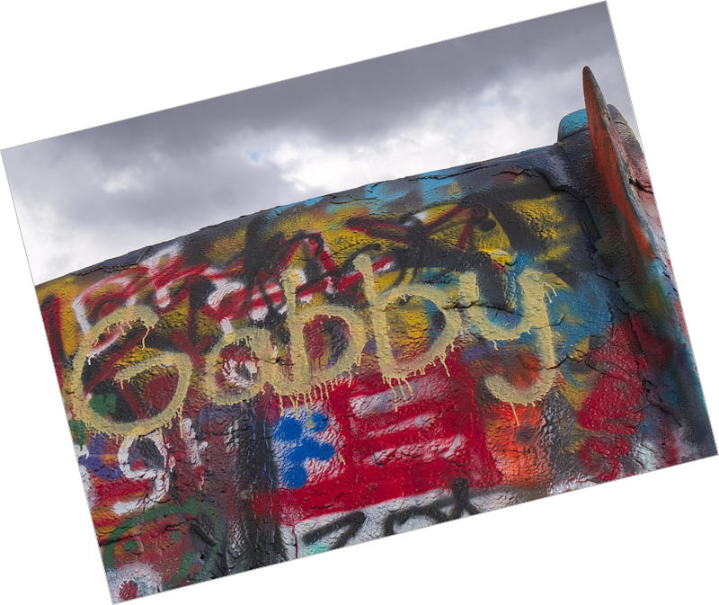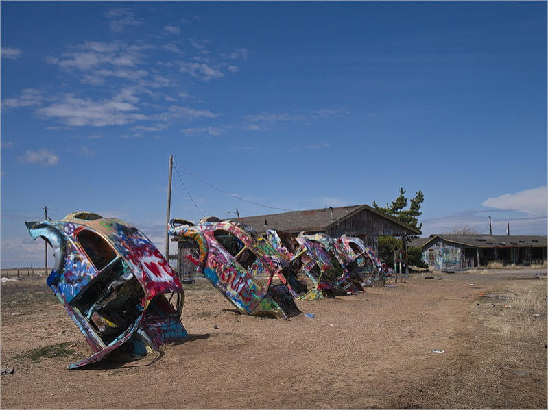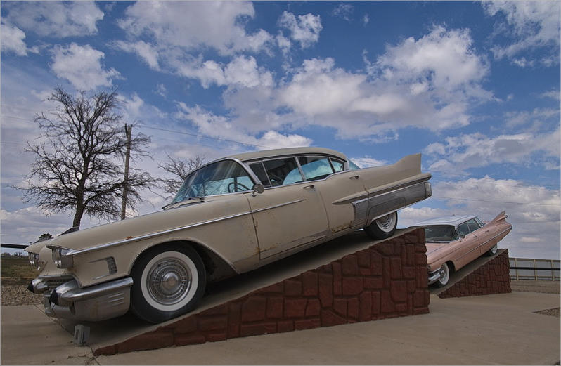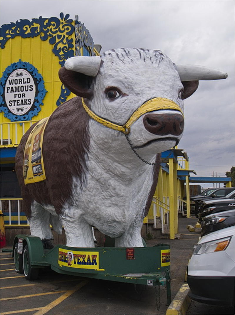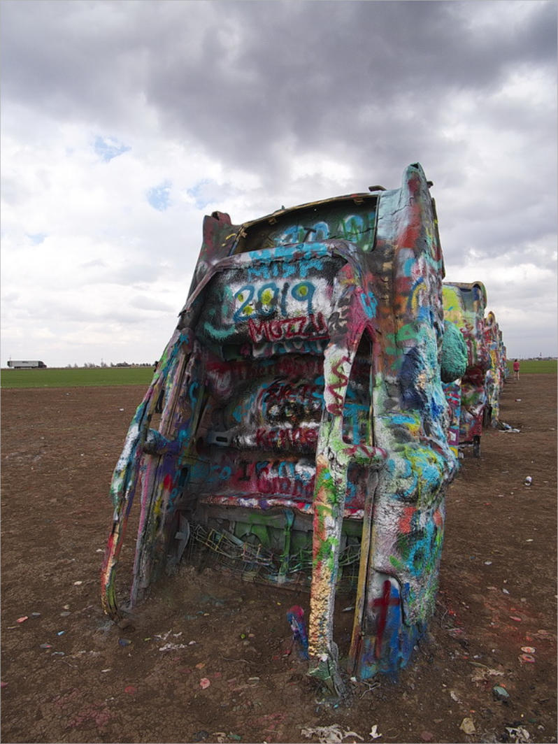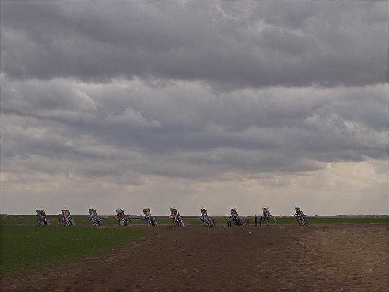 Nach einem Blick auf die Wetter-App heute Morgen war klar, dass wir nicht wie geplant im Palo Duro Canyon wandern würden. Die Wetteraussichten waren leider nicht gerade berauschend. Uns wurde starker Wind und sogar ein Tornado angekündigt. Keine tollen Aussichten für eine Wanderung. Wir ließen es daher gemütlich angehen. Irgendwie passte es auch, denn wir beide fühlten uns nicht so richtig wohl. Gabi kämpfte schon seit gestern mit Halsschmerzen und mich quälte meine Stirnhöhle.. Als wir uns aufmachten um zu frühstücken, hingen dicke Regenwolken über Canyon. Hetzen mussten wir heute also nicht. Wir gönnten uns daher erst einmal ein gemütliches Frühstück. Im Ranch House Cafe bekamen wir alles was unser Herz begehrte. Wir lieben ja diese kleinen einheimischen Frühstücksbuden. Hier ist man sofort unter ganz normalen Leuten. Die Bedienung war wie gewohnt super nett, die Portionen üppig und alles war sehr lecker. So lassen wir uns den Start in den Tag gefallen!!! Anschließend fuhren wir zum Walmart Medikamente kaufen usw. Als wir nach ca. 1 ½ Stunden dort wieder raus kamen, blickten wir auf blauen Himmel, garniert mit windigen Wölkchen und die Sonne schien auf uns herab. Herrlich! Während wir Shoppen waren hatte es offensichtlich geregnet. Jetzt war genau das richtige Wetter, um zur Route 66 zu fahren. Es geht halt nichts über das richtige Timing. Bevor wir uns auf den Weg machten, wollten wir noch einen guten Cappuccino mitnehmen. Navilinchen lotste uns zur Palace Coffee Company. Eine gute Wahl. Nicht nur wegen dem guten Kaffee, sondern auch wegen der Umgebung, denn diese Filiale befindet sich in einer historischen Gebäudereihe rund um das Gerichtsgebäude von Canyon. Wer weiß, ob wir ohne diese Kaffeesuche hier hingekommen wären. Da gute Kaffeebuden in Texas recht selten sind, war dieses Cafe sehr gut besucht und so dauerte das Cappu- Besorgen mal wieder eine kleine Ewigkeit. Wir entschieden uns daher, bis Amarillo auf dem Interstate zu fahren. Um auf die Route 66 zu kommen, mussten wir erst einmal durch Amarillo fahren. Hier war die Hölle los und Baustellen zwangen uns dazu, kreuz und quer durch die Stadt zu fahren. Obwohl uns das Städtchen im Vorbeifahren ganz gut gefiel, fanden wir leider keine Möglichkeit zum Anhalten und so gibt es keine Fotos von unseren Eindrücken. Bei der ersten sich bietenden Gelegenheit fuhren wir auf die Route 66, die bei Amarillo mehrere Meilen parallel zum Interstate 40 entlang führt. Das war vielleicht ein komisches Gefühl. Während wir logischerweise auf der rechten Fahrbahn fuhren, rauschte rechts von uns der Gegenverkehr des Interstates entlang. Das war schon extrem seltsam. Zum Glück war auf der Route 66 so gut wie nichts los, so dass wir recht gemächlich entlangzuckeln konnten. Am sog. Patriot Peace Garden fuhren wir vorbei. Dafür stoppten wir an diesem interessanten Strommast. Diese Bauart war uns bisher noch nicht untergekommen. Kurz vor 13:00 Uhr näherten wir uns so langsam unserem ersten Ziel. Dafür mussten wir den Interstate kreuzen. Doch bevor wir zu den Objekten unserer Begierde kamen, stellten sich uns ein paar schöne alte Schilder in den Weg. Lasst euch von dem blauen Himmel nicht täuschen. Hier wehte ein echt heftiger Wind. Wow, Ziel erreicht! Die bunten Käferchen waren sogar noch hübscher als gedacht. Was für eine nette Idee!!! Wer wohl diese VW Slug Bug Ranch initiiert hatte?Klar, dass der Kameraauslöser zu glühen begann. Hier gab es sogar noch mehr zu sehen, als nur die bunten Käfer. An der abgewrackten Tanke entdeckten wir auch noch einen angemalten Pritschenwagen Nachdem wir alles fotografiert hatten, was uns gefallen hat, zogen wir so langsam weiter. Diesmal blieben wir auf der anderen Seite des Interstate. Unsere Route führte uns wieder gen Amarillo. Passend zur Mittagszeit kamen wir zum Big Texan Steakhouse.. Noch waren wir allerdings unsicher, ob wir in dieser Touristenschwemme wirklich was essen wollten bzw. sollten. Noch etwas unschlüssig fotografierten wir daher erst einmal die riesigen Reklameschilder auf dem Parkplatz. Da sich der Himmel immer weiter zuzog und es sogar etwas anfing zu tröpfeln, entschieden wir, hinein zu gehen. Gabi hatte diesmal mit ihrer Essensbestellung ein glücklicheres Händchen. Ihr Burger war ganz o.k. Mein Essen hingegen war ein mit Käse überbackener Brabsch. Zum Glück war ich nicht sehr hungrig. Zumindest wettertechnisch hatte sich unser Aufenthalt gelohnt. Die dicken Regenwolken waren inzwischen weitergezogen. Und weil es gerade so schön war, statteten wir dem 2nd Amendment Cowboy und seinen drei prominent besetzen Cadillacs einen Besuch ab. In den Autos sitzen Elvis, Willy Nelson und John Wayne.. Keine Ahnung, ob es sich hierbei wirklich um Original-Autos der Stars handelt oder lediglich um Modelle, die sie gefahren sind. Interessant fanden wir, dass der Cowboy trotz seines Namens keine Waffe trug. Trotz dieser Wetteraussichten beschlossen wir, unser nächstes Ziel anzusteuern. Wie man sehr schön an den Wolken sehen kann, hatte der Wind einiges an Tempo aufgenommen. Der angekündigte Tornado war wohl nicht mehr fern. Wir zackerten an der Cadillac Ranch daher nicht lange herum und schauten, dass wir unsere Fotos schnell auf den Chip gebannt bekamen. Gabi hatte sich schon verewigt. Ok, mit der richtigen Schreibweise haperte es zwar etwas, aber wie sagt man so schön: „Aller Anfang ist schwer.“ Als wir auf der Fahrt nach Canyon einmal falsch abbogen, entdeckten wir dieses interessante Gefährt: In Canyon wollten wir dann noch ins Panhandle Museum. Blöderweise lotste uns Navilinchen ins Panhandle Museum von Amarillo. Dieses ist aber kein Ranch-Museum sondern ein Kriegs-Museum. Da wollten wir nicht rein. Bis wir in Canyon ankamen, war das Penhandle Museum leider schon zu. Schade, aber was soll's. Da wir jetzt doch noch etwas Zeit hatten und nicht besonders hungrig waren, machten wir uns noch auf die Suche nach einem weiteren riesigen Cowboy, den wir e