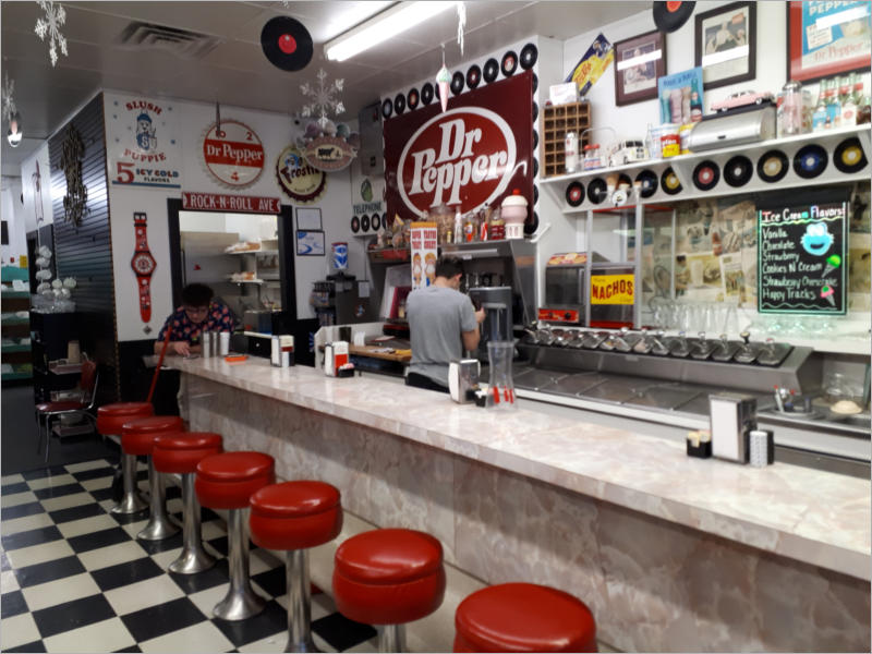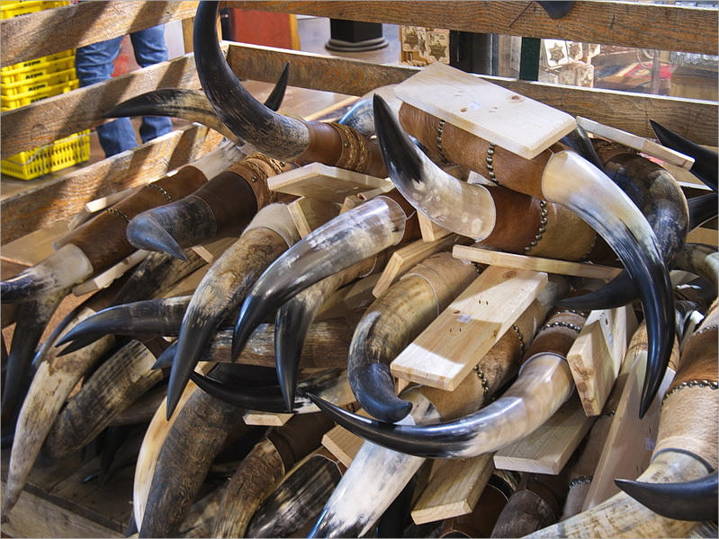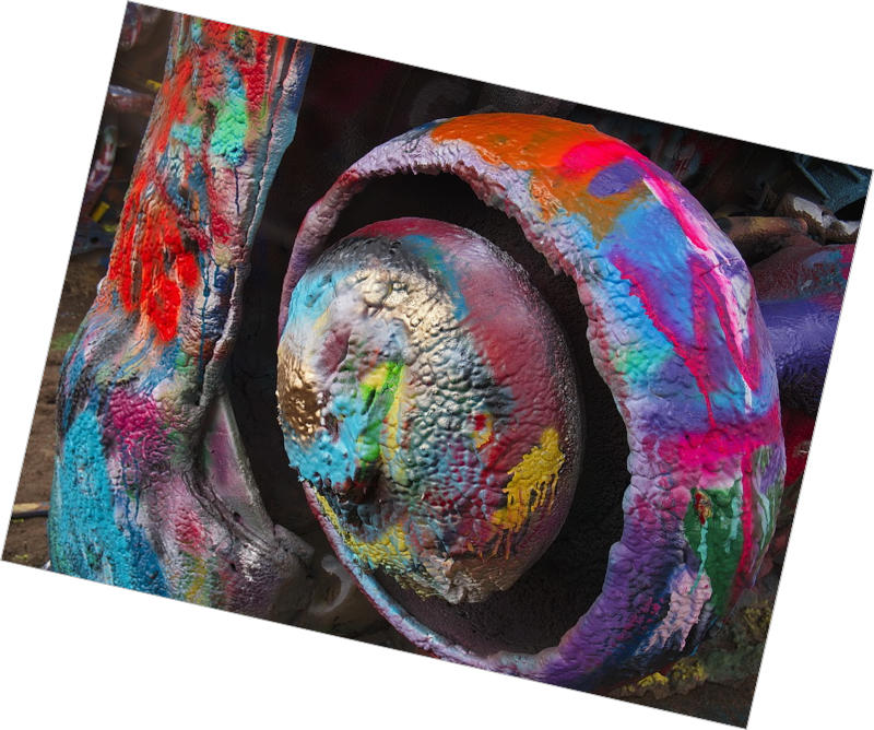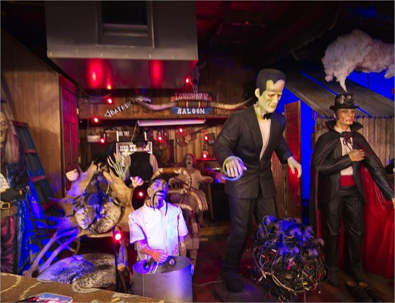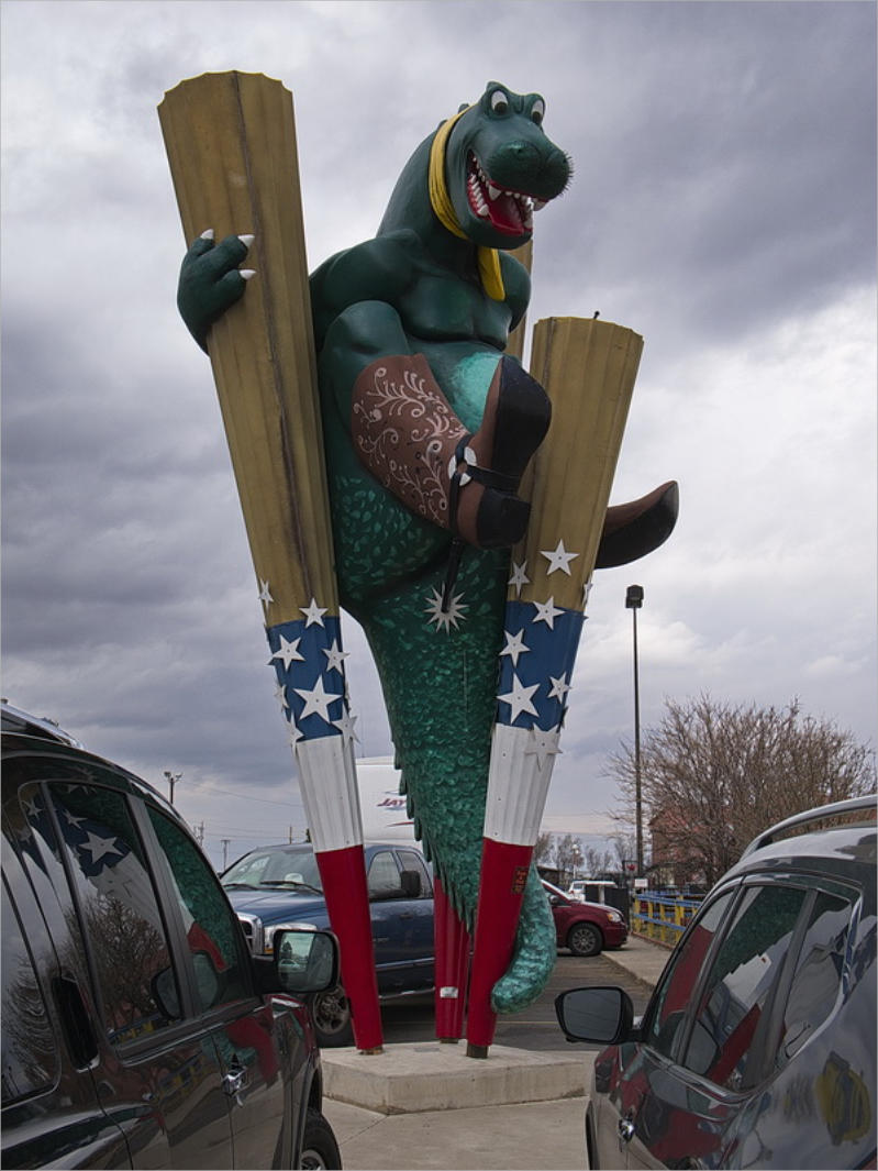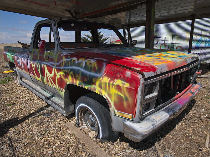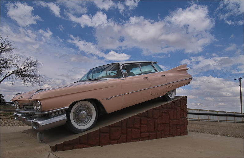 Nach einem Blick auf die Wetter-App heute Morgen war klar, dass wir nicht wie geplant im Palo Duro Canyon wandern würden. Die Wetteraussichten waren leider nicht gerade berauschend. Uns wurde starker Wind und sogar ein Tornado angekündigt. Keine tollen Aussichten für eine Wanderung. Wir ließen es daher gemütlich angehen. Irgendwie passte es auch, denn wir beide fühlten uns nicht so richtig wohl. Gabi kämpfte schon seit gestern mit Halsschmerzen und mich quälte meine Stirnhöhle.. Als wir uns aufmachten um zu frühstücken, hingen dicke Regenwolken über Canyon. Hetzen mussten wir heute also nicht. Wir gönnten uns daher erst einmal ein gemütliches Frühstück. Im Ranch House Cafe bekamen wir alles was unser Herz begehrte. Wir lieben ja diese kleinen einheimischen Frühstücksbuden. Hier ist man sofort unter ganz normalen Leuten. Die Bedienung war wie gewohnt super nett, die Portionen üppig und alles war sehr lecker. So lassen wir uns den Start in den Tag gefallen!!! Anschließend fuhren wir zum Walmart Medikamente kaufen usw. Als wir nach ca. 1 ½ Stunden dort wieder raus kamen, blickten wir auf blauen Himmel, garniert mit windigen Wölkchen und die Sonne schien auf uns herab. Herrlich! Während wir Shoppen waren hatte es offensichtlich geregnet. Jetzt war genau das richtige Wetter, um zur Route 66 zu fahren. Es geht halt nichts über das richtige Timing. Bevor wir uns auf den Weg machten, wollten wir noch einen guten Cappuccino mitnehmen. Navilinchen lotste uns zur Palace Coffee Company. Eine gute Wahl. Nicht nur wegen dem guten Kaffee, sondern auch wegen der Umgebung, denn diese Filiale befindet sich in einer historischen Gebäudereihe rund um das Gerichtsgebäude von Canyon. Wer weiß, ob wir ohne diese Kaffeesuche hier hingekommen wären. Da gute Kaffeebuden in Texas recht selten sind, war dieses Cafe sehr gut besucht und so dauerte das Cappu- Besorgen mal wieder eine kleine Ewigkeit. Wir entschieden uns daher, bis Amarillo auf dem Interstate zu fahren. Um auf die Route 66 zu kommen, mussten wir erst einmal durch Amarillo fahren. Hier war die Hölle los und Baustellen zwangen uns dazu, kreuz und quer durch die Stadt zu fahren. Obwohl uns das Städtchen im Vorbeifahren ganz gut gefiel, fanden wir leider keine Möglichkeit zum Anhalten und so gibt es keine Fotos von unseren Eindrücken. Bei der ersten sich bietenden Gelegenheit fuhren wir auf die Route 66, die bei Amarillo mehrere Meilen parallel zum Interstate 40 entlang führt. Das war vielleicht ein komisches Gefühl. Während wir logischerweise auf der rechten Fahrbahn fuhren, rauschte rechts von uns der Gegenverkehr des Interstates entlang. Das war schon extrem seltsam. Zum Glück war auf der Route 66 so gut wie nichts los, so dass wir recht gemächlich entlangzuckeln konnten. Am sog. Patriot Peace Garden fuhren wir vorbei. Dafür stoppten wir an diesem interessanten Strommast. Diese Bauart war uns bisher noch nicht untergekommen. Kurz vor 13:00 Uhr näherten wir uns so langsam unserem ersten Ziel. Dafür mussten wir den Interstate kreuzen. Doch bevor wir zu den Objekten unserer Begierde kamen, stellten sich uns ein paar schöne alte Schilder in den Weg. Lasst euch von dem blauen Himmel nicht täuschen. Hier wehte ein echt heftiger Wind. Wow, Ziel erreicht! Die bunten Käferchen waren sogar noch hübscher als gedacht. Was für eine nette Idee!!! Wer wohl diese VW Slug Bug Ranch initiiert hatte?Klar, dass der Kameraauslöser zu glühen begann. Hier gab es sogar noch mehr zu sehen, als nur die bunten Käfer. An der abgewrackten Tanke entdeckten wir auch noch einen angemalten Pritschenwagen Nachdem wir alles fotografiert hatten, was uns gefallen hat, zogen wir so langsam weiter. Diesmal blieben wir auf der anderen Seite des Interstate. Unsere Route führte uns wieder gen Amarillo. Passend zur Mittagszeit kamen wir zum Big Texan Steakhouse.. Noch waren wir allerdings unsicher, ob wir in dieser Touristenschwemme wirklich was essen wollten bzw. sollten. Noch etwas unschlüssig fotografierten wir daher erst einmal die riesigen Reklameschilder auf dem Parkplatz. Da sich der Himmel immer weiter zuzog und es sogar etwas anfing zu tröpfeln, entschieden wir, hinein zu gehen. Gabi hatte diesmal mit ihrer Essensbestellung ein glücklicheres Händchen. Ihr Burger war ganz o.k. Mein Essen hingegen war ein mit Käse überbackener Brabsch. Zum Glück war ich nicht sehr hungrig. Zumindest wettertechnisch hatte sich unser Aufenthalt gelohnt. Die dicken Regenwolken waren inzwischen weitergezogen. Und weil es gerade so schön war, statteten wir dem 2nd Amendment Cowboy und seinen drei prominent besetzen Cadillacs einen Besuch ab. In den Autos sitzen Elvis, Willy Nelson und John Wayne.. Keine Ahnung, ob es sich hierbei wirklich um Original-Autos der Stars handelt oder lediglich um Modelle, die sie gefahren sind. Interessant fanden wir, dass der Cowboy trotz seines Namens keine Waffe trug. Trotz dieser Wetteraussichten beschlossen wir, unser nächstes Ziel anzusteuern. Wie man sehr schön an den Wolken sehen kann, hatte der Wind einiges an Tempo aufgenommen. Der angekündigte Tornado war wohl nicht mehr fern. Wir zackerten an der Cadillac Ranch daher nicht lange herum und schauten, dass wir unsere Fotos schnell auf den Chip gebannt bekamen. Gabi hatte sich schon verewigt. Ok, mit der richtigen Schreibweise haperte es zwar etwas, aber wie sagt man so schön: „Aller Anfang ist schwer.“ Als wir auf der Fahrt nach Canyon einmal falsch abbogen, entdeckten wir dieses interessante Gefährt: In Canyon wollten wir dann noch ins Panhandle Museum. Blöderweise lotste uns Navilinchen ins Panhandle Museum von Amarillo. Dieses ist aber kein Ranch-Museum sondern ein Kriegs-Museum. Da wollten wir nicht rein. Bis wir in Canyon ankamen, war das Penhandle Museum leider schon zu. Schade, aber was soll's. Da wir jetzt doch noch etwas Zeit hatten und nicht besonders hungrig waren, machten wir uns noch auf die Suche nach einem weiteren riesigen Cowboy, den wir e