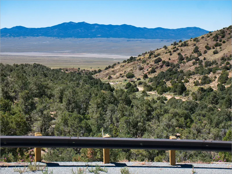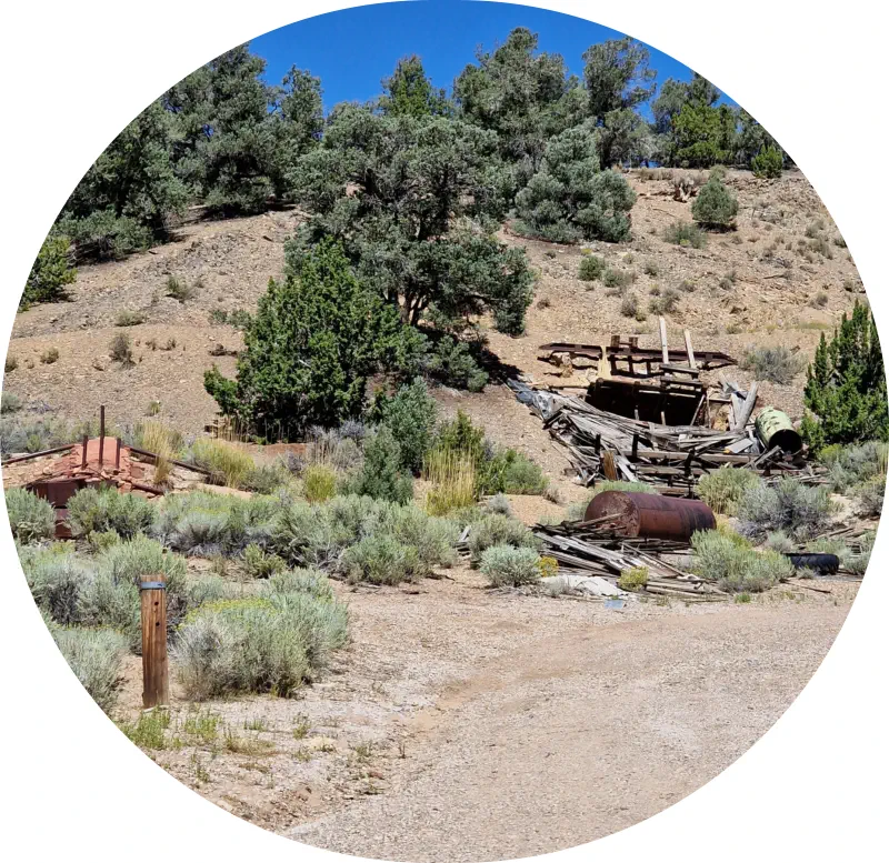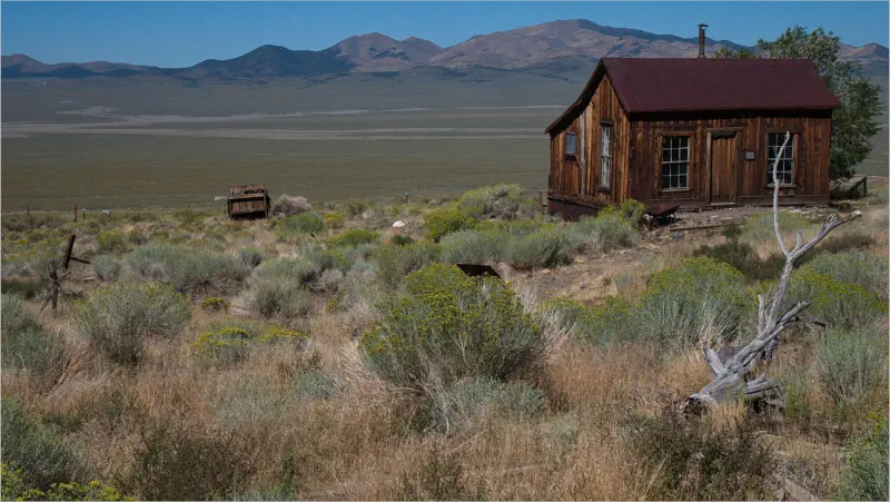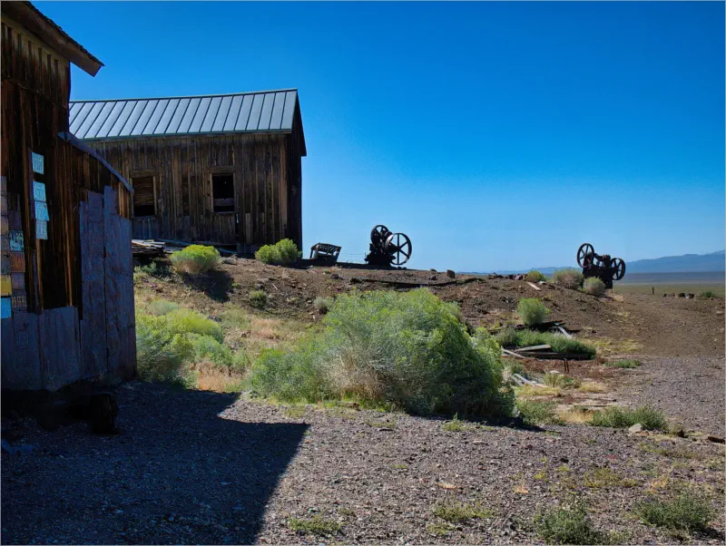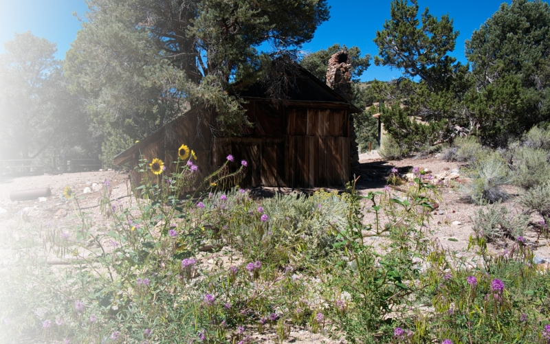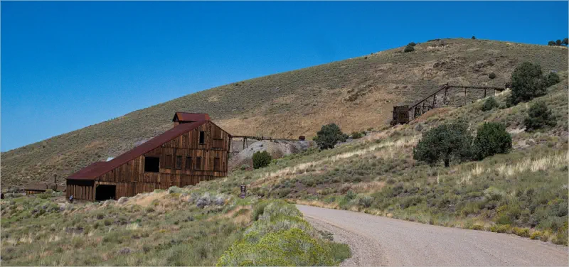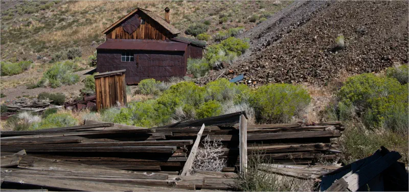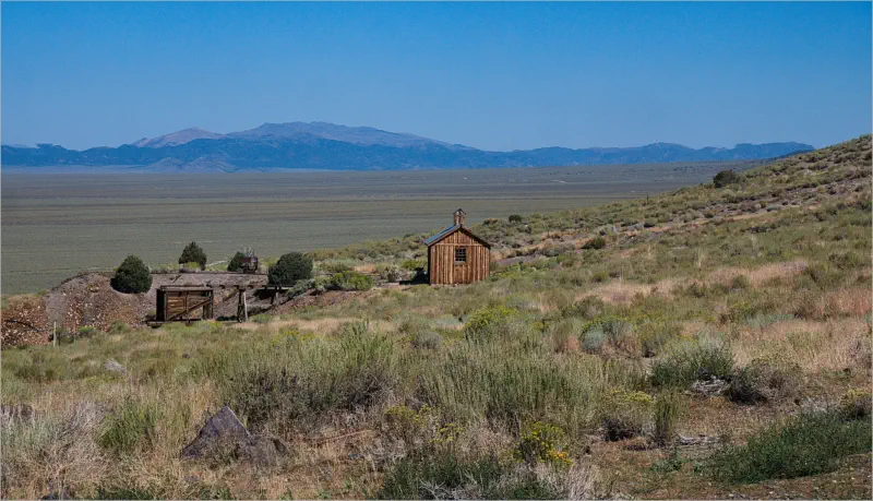 Vom Rastplatz aus hatte man sogar einen Blick auf eine recht gut erhaltene Mine und die schöne Bergwelt Nevadas.